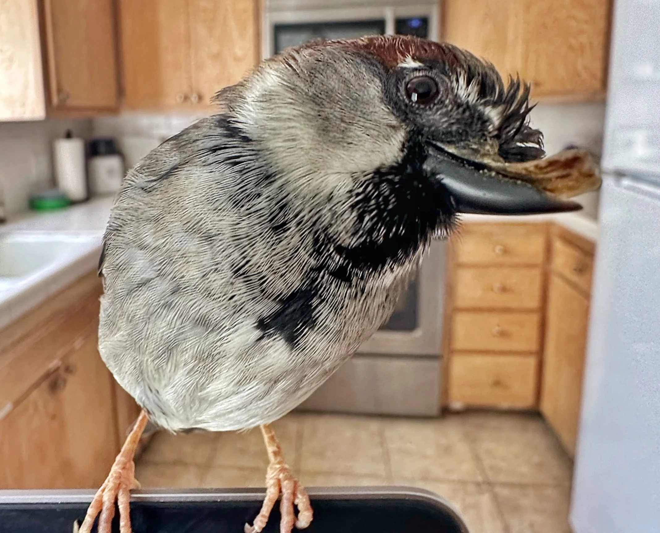 You can tell Happy is a male house sparrow by the distinct black “bib” under his chin and the gray crown on his head. Female sparrows look different—they’re usually lighter brown with no black markings and have a more subtle, sandy coloration.Tiny but Mighty: